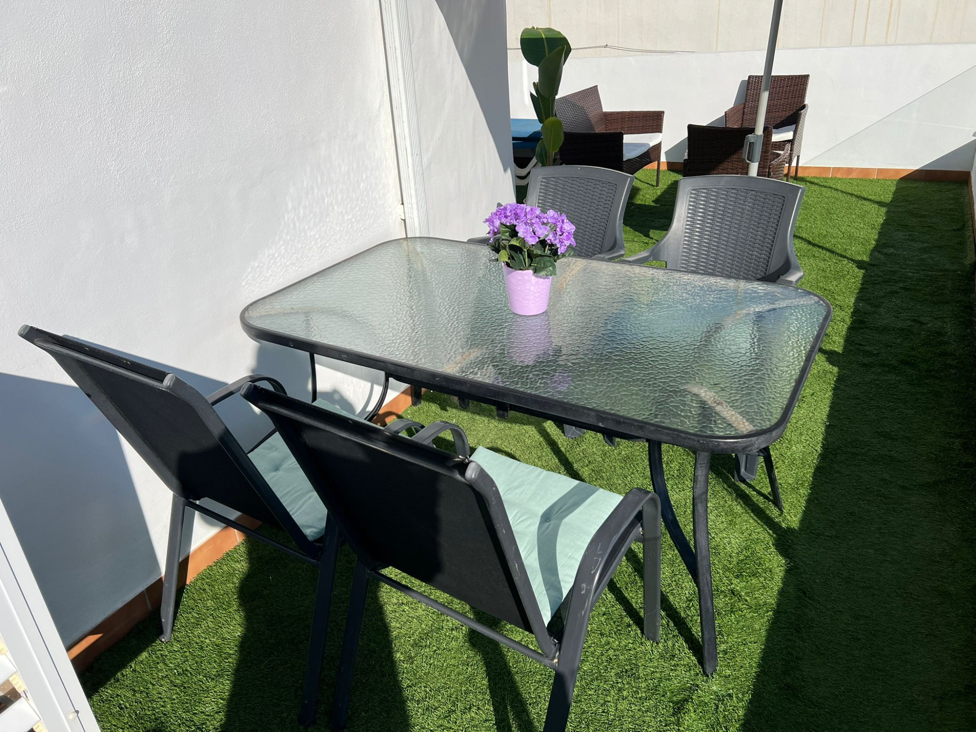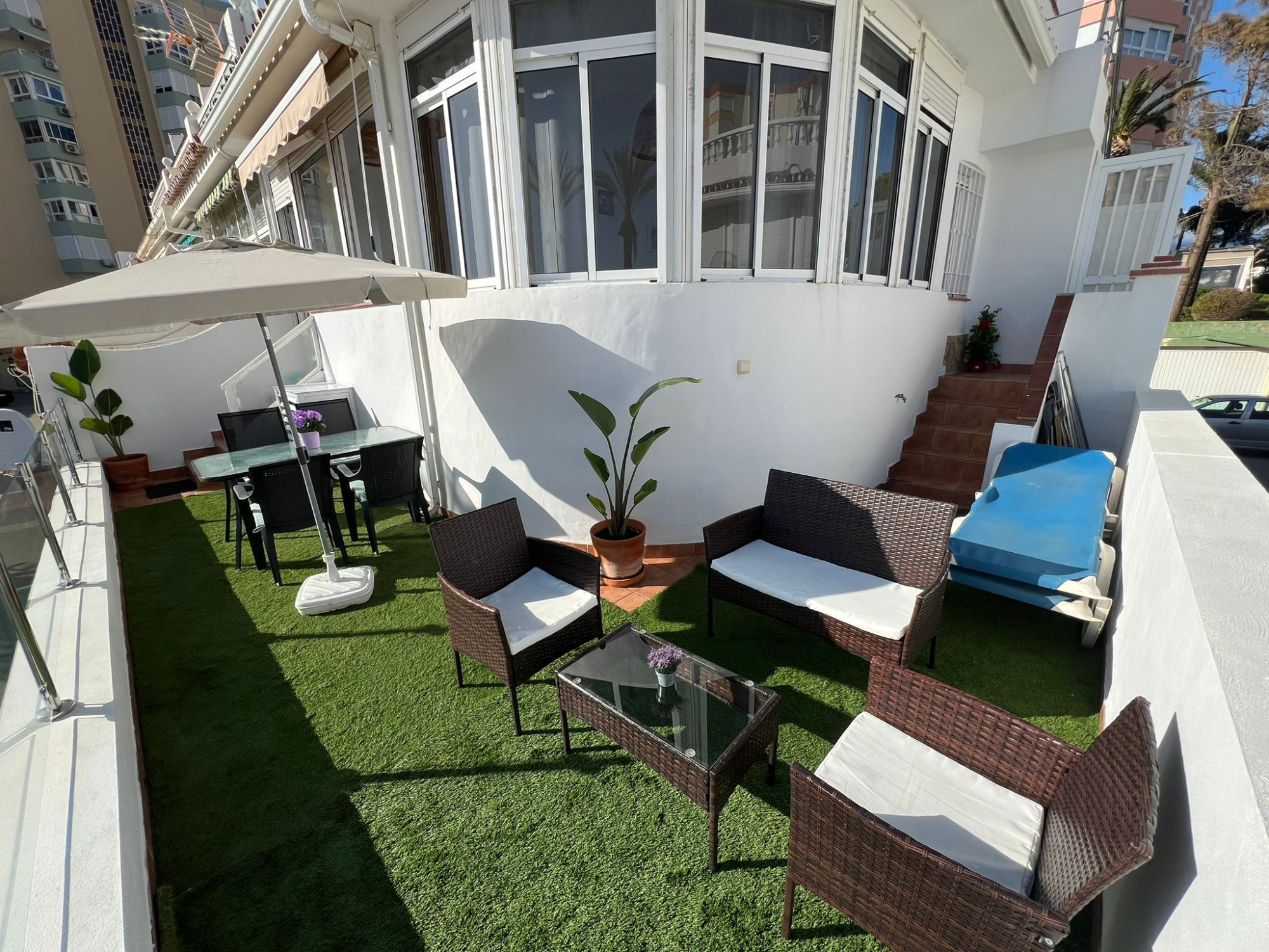 - Mobiliario de terraza: toldos - Tumbona [2] - Mesa y sillas - mesita auxiliar.